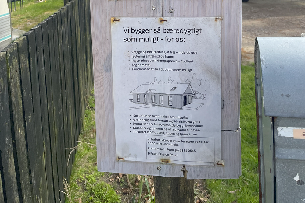 Vi var godt klar over at 100% bæredygtigt ville blive svært. Men ”80/20 reglen” skulle være målet forklarer Peter. Vi ønskede ikke at ”bo i en plasticpose”. Vi ville bygge med biobaserede materialer, så huset kunne leve og ånde